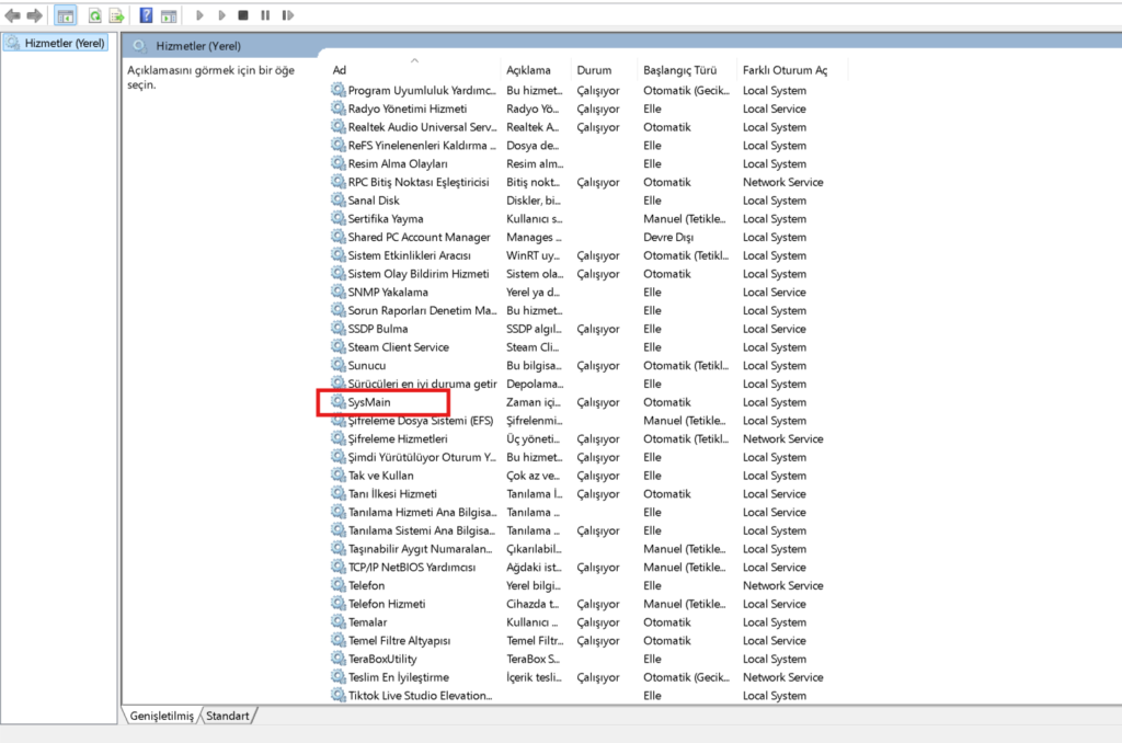 Eski adıyla Superfetch, yeni adıyla SysMain, sık kullandığınız uygulamaları RAM’e önceden yükleyerek hızlı açılmalarını sağlar. Ancak özellikle HDD (Hard Disk) kullanan veya sistem belleği düşük olan bilgisayarlarda bu hizmet sürekli bir döngüye girerek CPU ve Disk kullanımını %100’e kilitler.